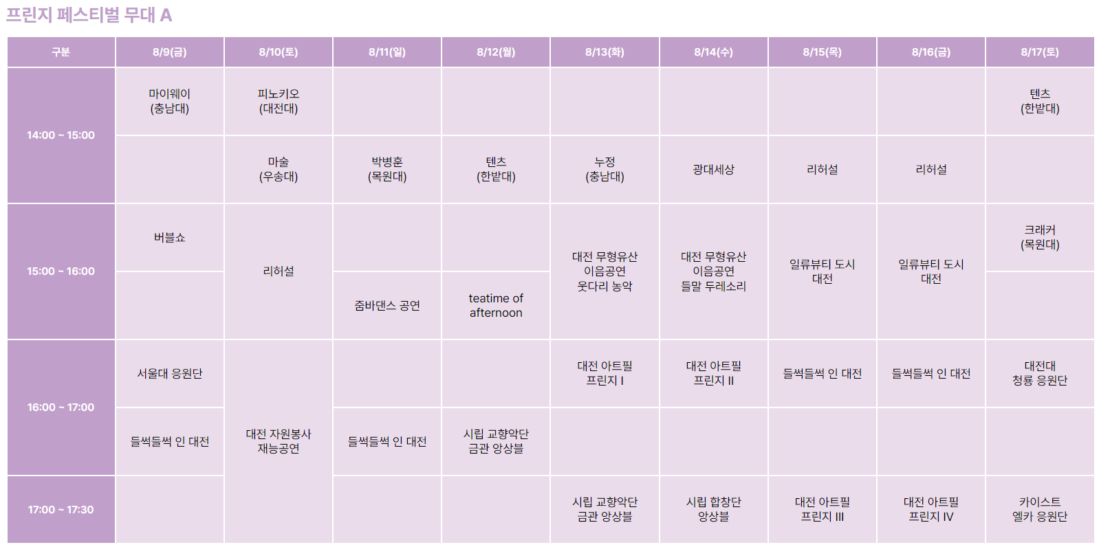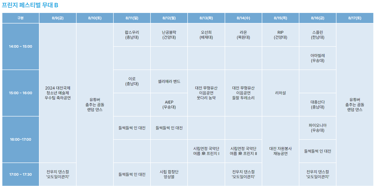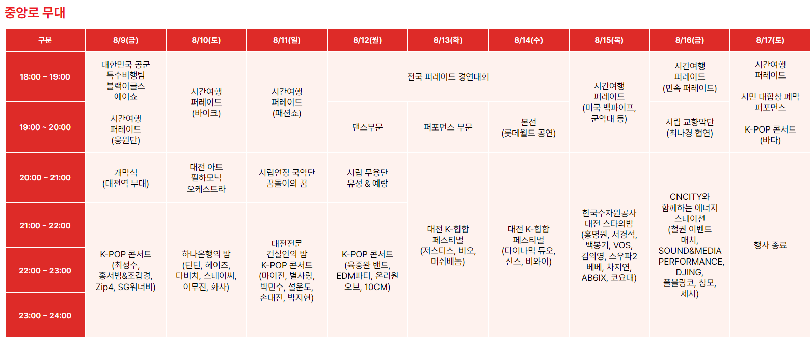 대전0시축제 9일간의 스케줄표 한번에 정리해 보세요!대전 0시 축제는 대전이 대표적인 문화 축제로 다양한 공연과 이벤트를 통해 풍부한 문화 경험을 제공하는 행사입니다. 올해 축제는 8월 9