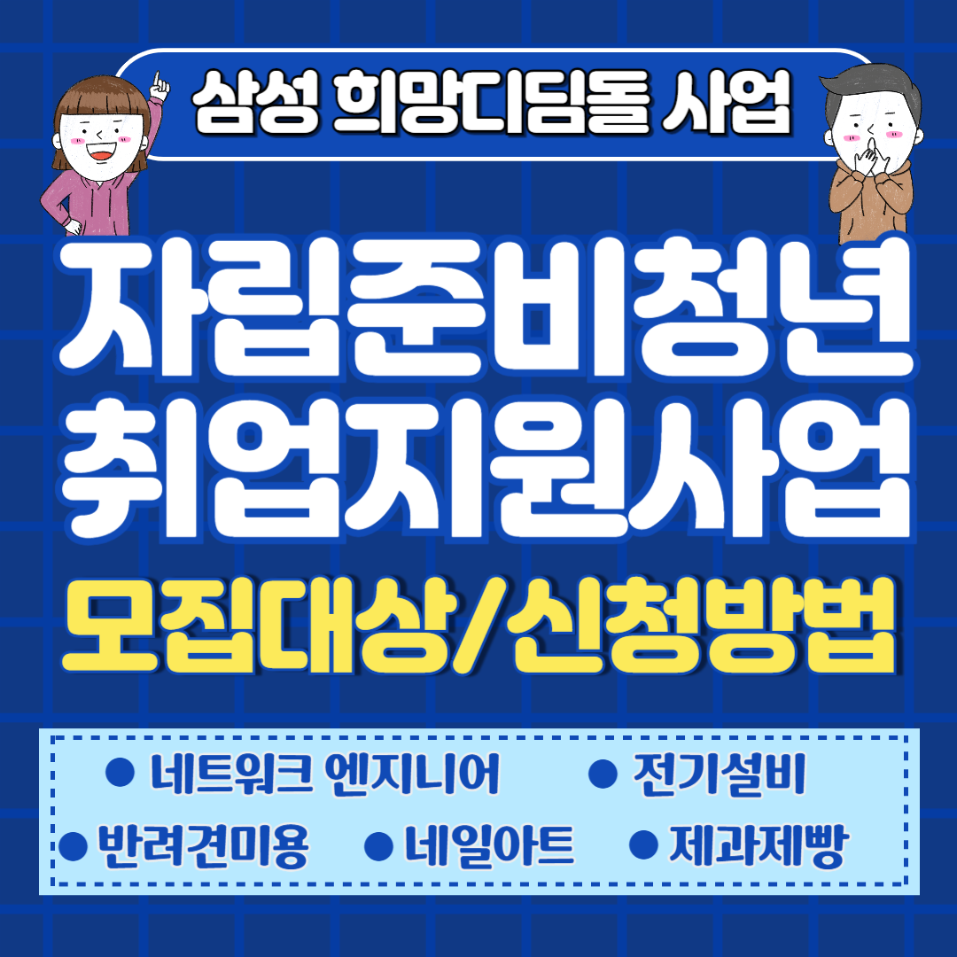 삼성전자는 10개 지방자치단체에 희망디딤돌센터를 설립해 자립통합체계를 구축하고 있습니다. 희망디딤돌에서는 자립을 준비하는 청년들을 위해 취업지원사업 참가자를 모집하고 있습니다.